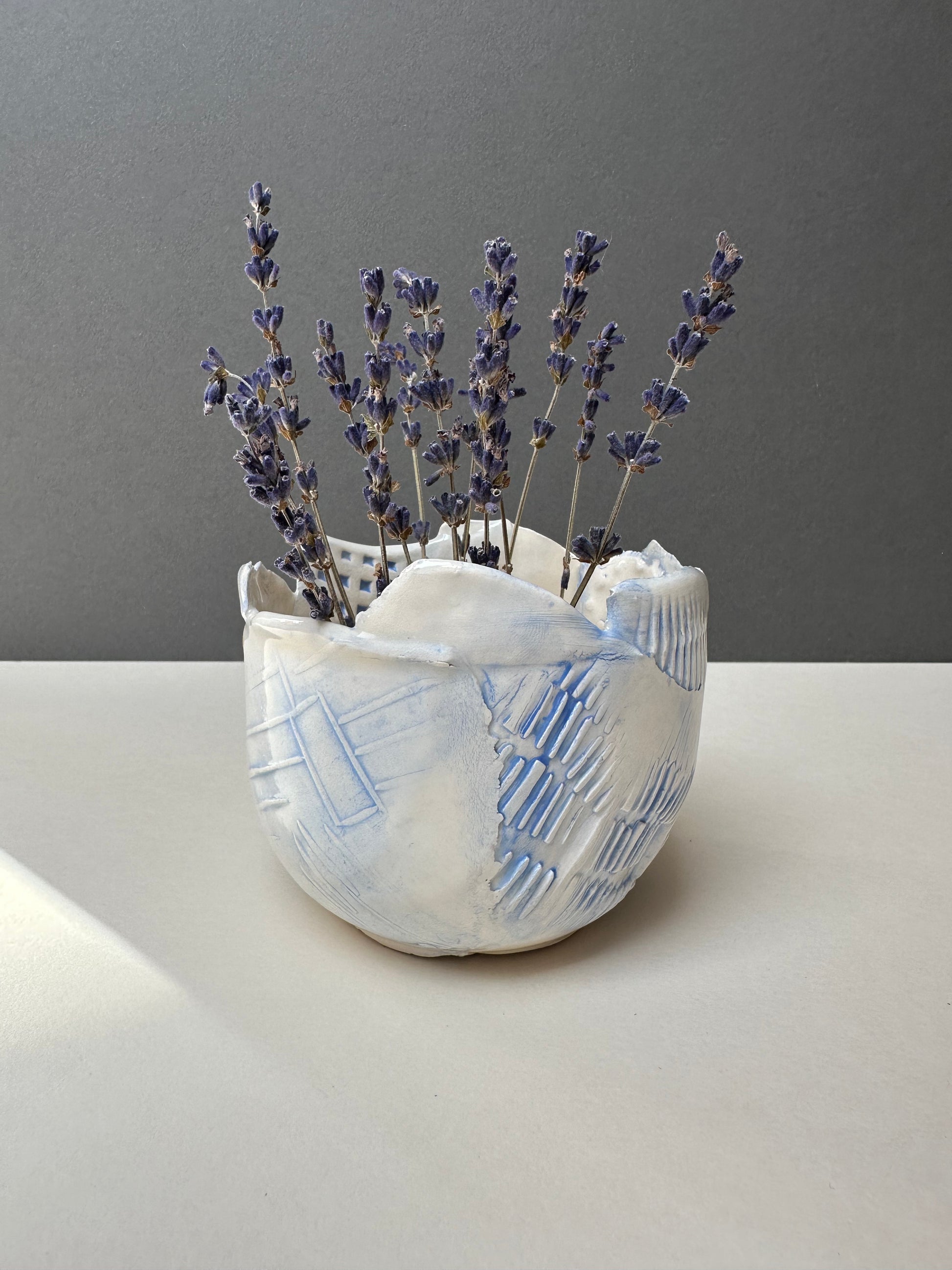 This handcrafted textured bowl is made from white earthenware clay and finished with beautiful underglaze and transparent glaze. Every piece is unique, featuring intricate textures that make it perfect for serving, display, or simply adding artisanal charm to your home. Due to the handmade nature, slight variations in size and texture make each bowl truly one-of-a-kind.