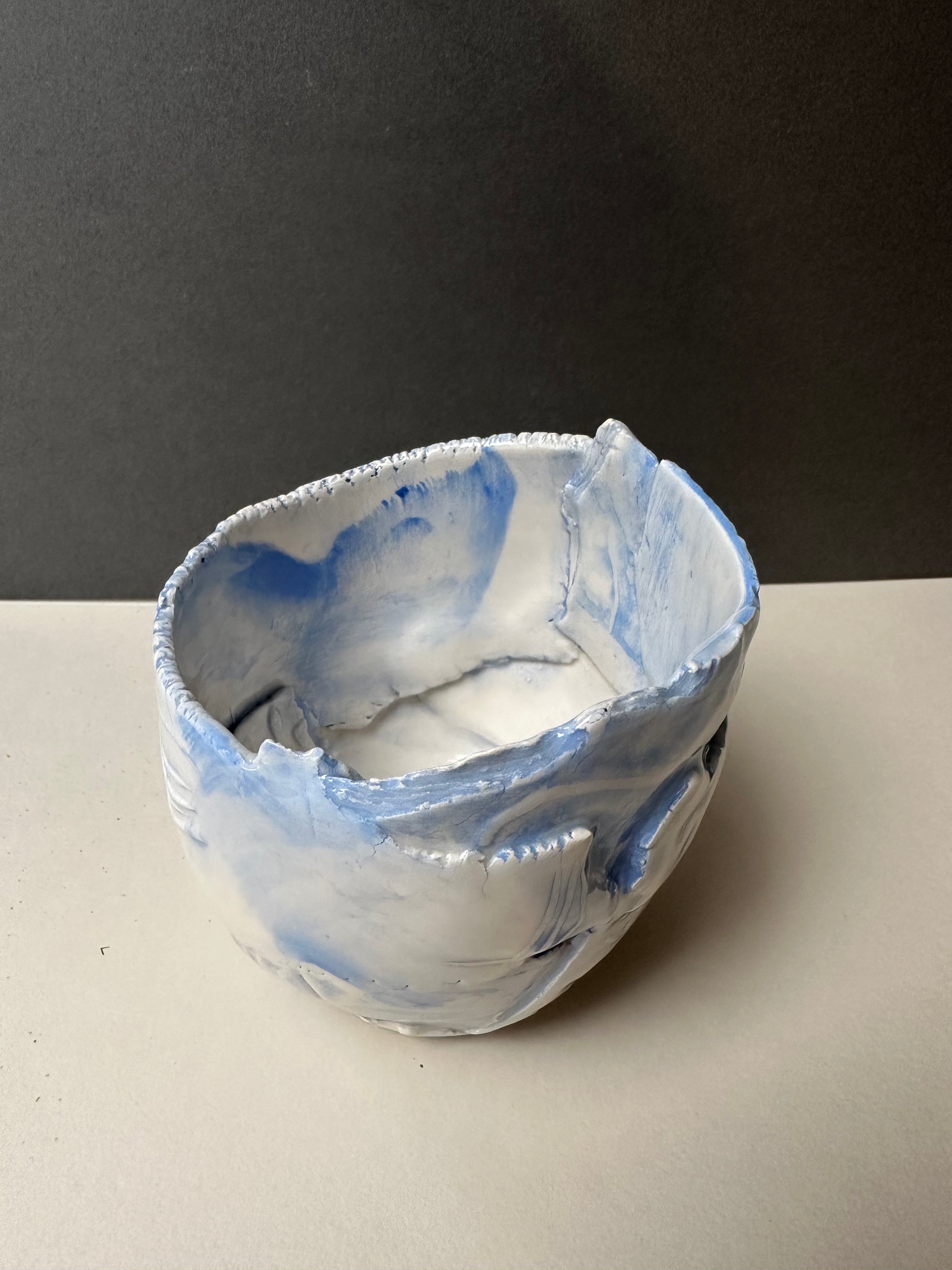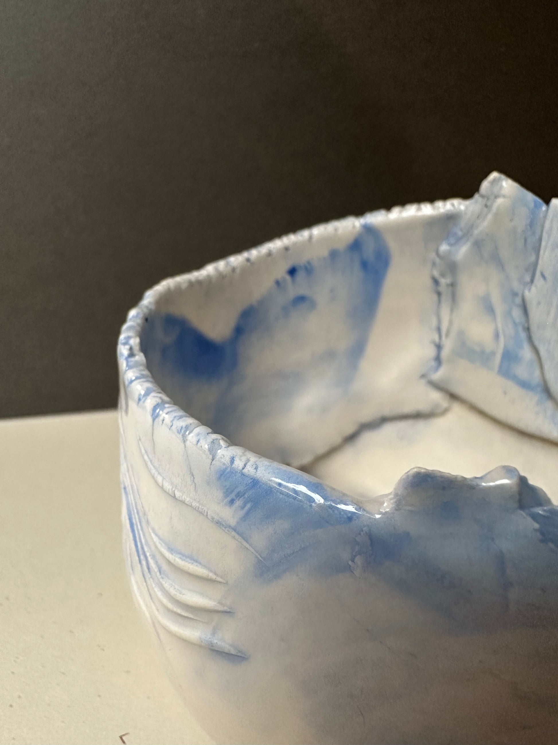 Small textured bowl, made with white earthenware clay. Decorated with blue underglaze and clear gloss glaze.
